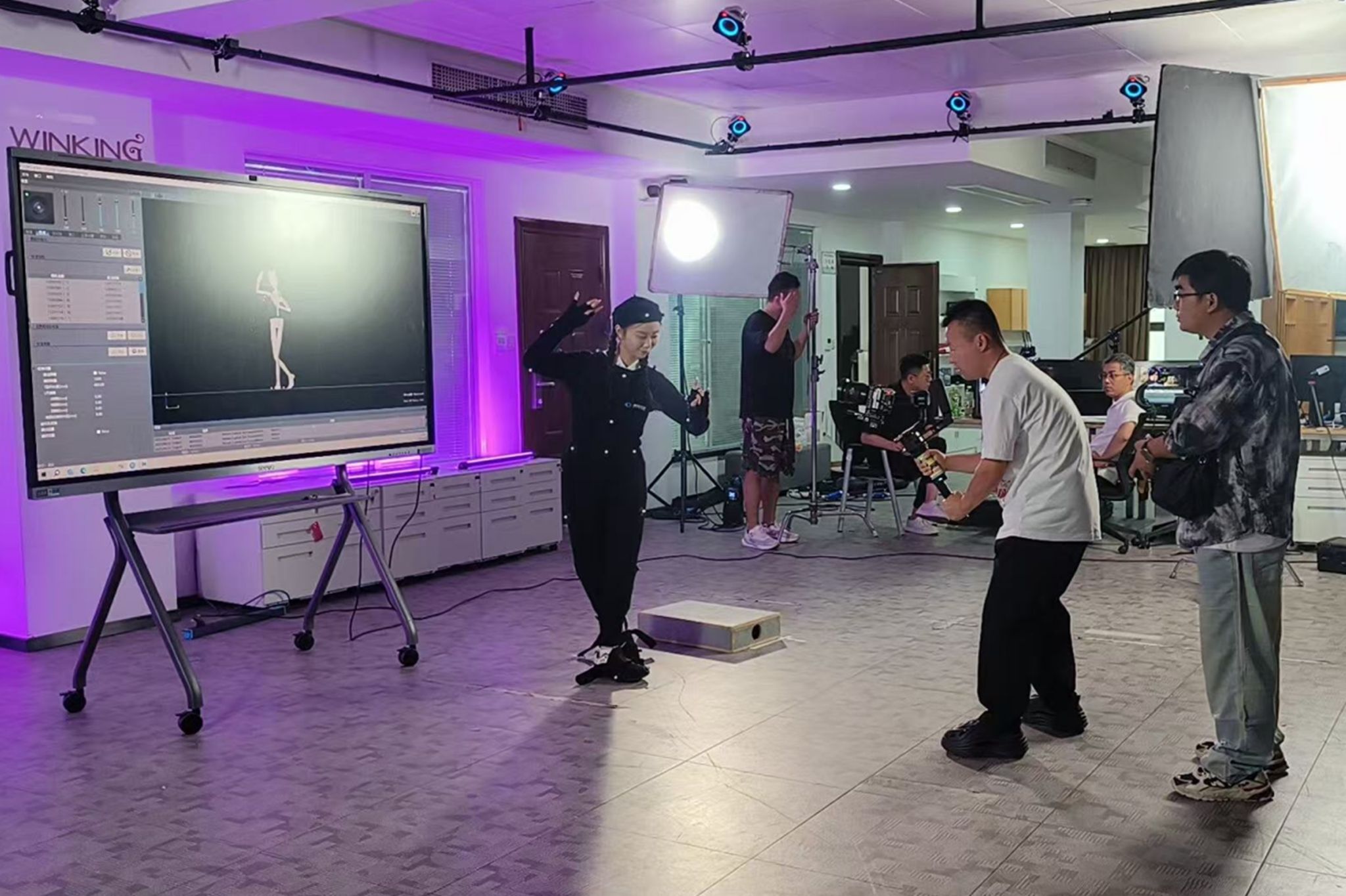 此外,在活动筹备阶段,学校动漫专业师生还受邀参与江苏省电视台城市频道宣传片的录制。片中数字人技术展示环节在学校动捕实训室完成拍摄。学生以良好的专业技能,为数字人制作与动捕流程提供了有力支持,体现了学校在实训教学与产教融合方面的实践成果。