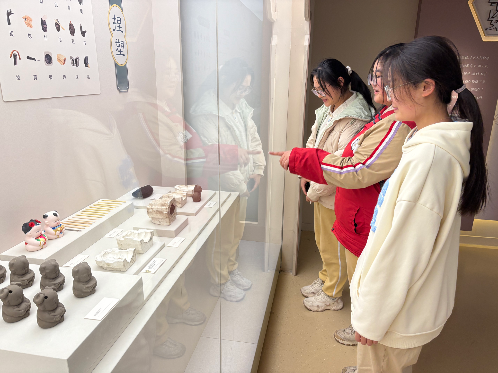 在“无锡惠山泥人展”展厅,同学们被一系列色彩明快、造型生动、工艺精湛的泥塑作品深深吸引。从憨态可掬的“大阿福”,到细腻传神的戏曲人物,再到充满生活气息的市井形象,惠山泥人独特的捏塑技法、夸张简练的造型语言以及富有乡土气息的彩绘风格,让大家直观感受到了传统泥土艺术的温度与生命力。同学们认真聆听讲解,仔细观察作品的细节处理与表现手法,并不时用相机捕捉,试图解析一块普通泥土如何经由匠人之手,被赋予鲜活灵魂的创作密码。