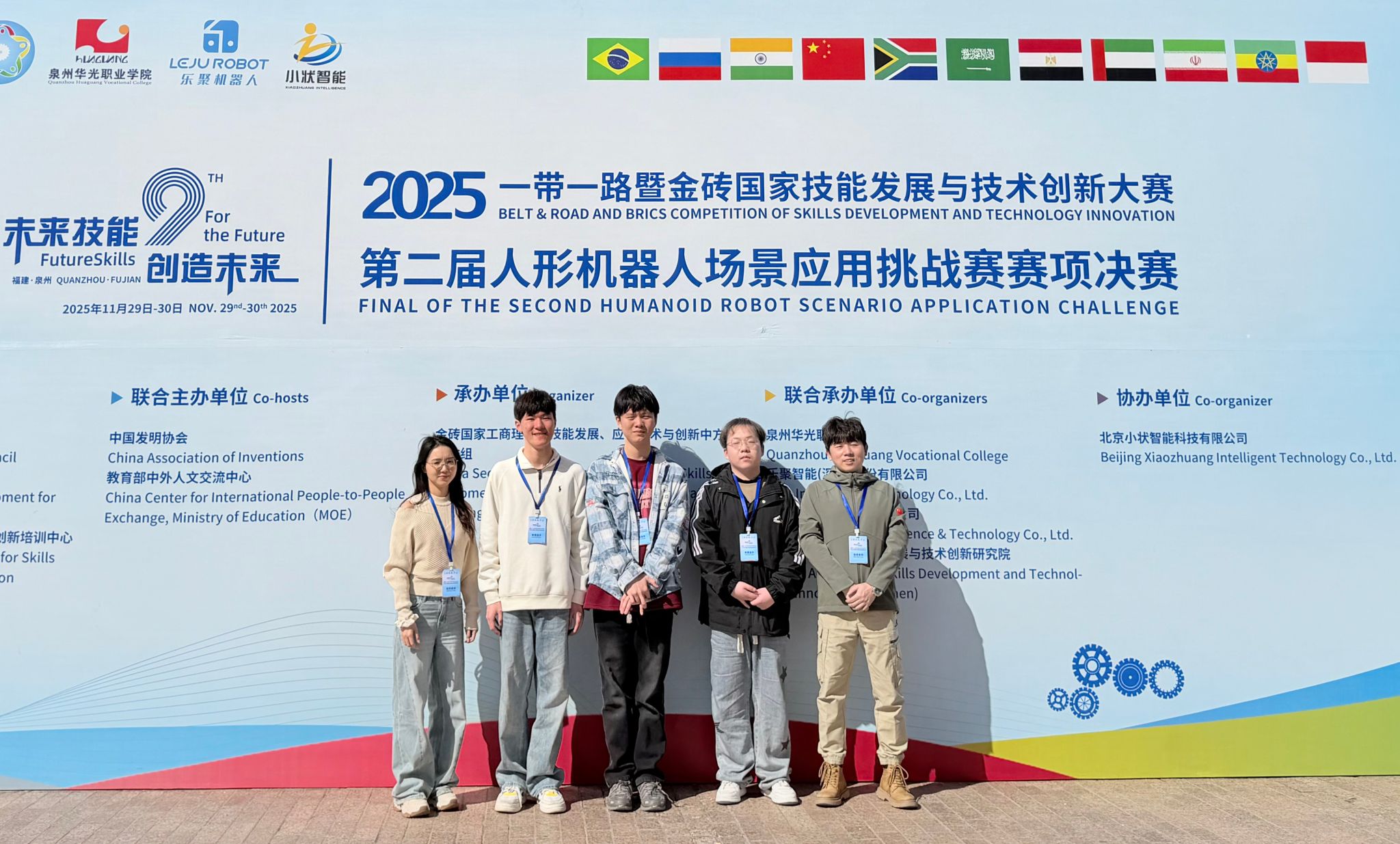 11月30日下午,由金砖国家工商理事会中方理事会、“一带一路”暨金砖国家技能发展国际联盟等单位联合主办的2025“一带一路”暨金砖国家技能发展与技术创新大赛第二届人形机器人场景应用挑战赛在泉州华光职业学院落幕。来自全国14个省份的近百支代表队、300多名参赛选手共同见证了这场智慧与技能的盛典。我校信息艺术系王曦冉、张新涛、王向宇三位同学组队参赛,获全国总决赛高职组二等奖。